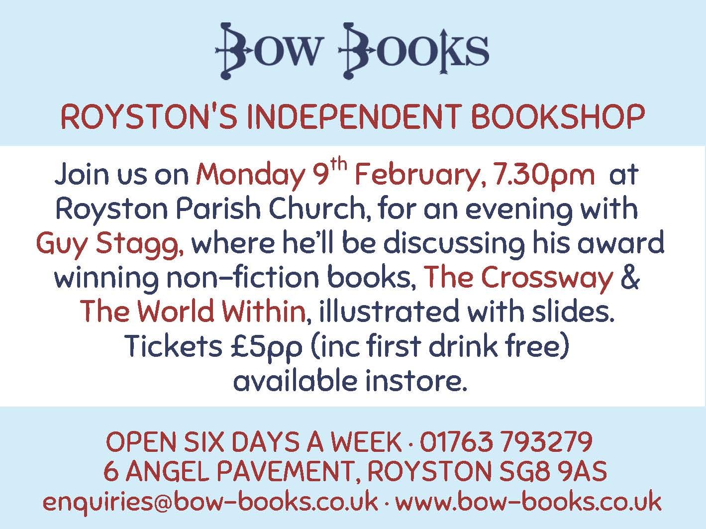 A huge thank you to all our customers for your continued support in the lead-up to Christmas and throughout 2025. Don’t forget to pop in and exchange any Book Tokens you may have received over the festive season. You can also make the most of our great 3-for-2 offers on all children’s books, plus adult second-hand titles. Keep an eye out for some fantastic January bargains too! And save the date for our next event: Monday 9th February, 7.30pm at Royston Parish Church, where Guy Stagg will discuss his award-winning non-fiction books The Crossway and The World Within, illustrated with slides. More information and tickets are available in store. Tickets available from Bow Bookshop, 6 Angel Pavement, Royston SG8 9AS. Open Mon-Fri 10am-5pm & Sat 9am-5pm 01763 793279 | www.bow-books.co.uk