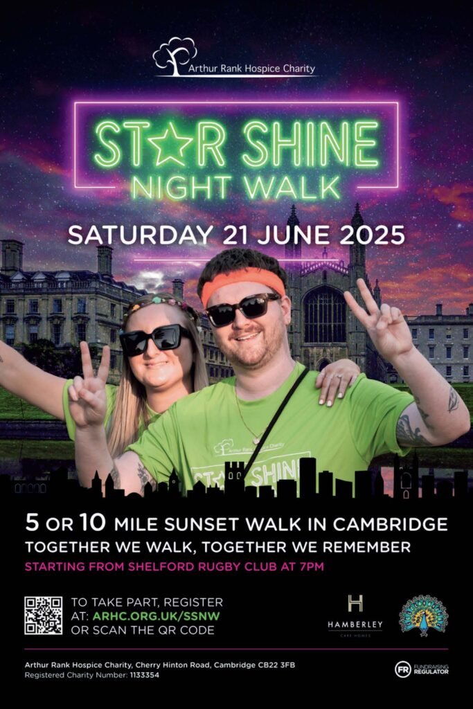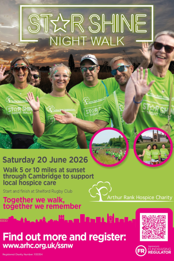 Walk to support Hospice Care Arthur Rank Hospice Charity’s Star Shine Night Walk is back for 2026 and you can book two unforgettable sunset walks on Saturday 16th May in Wisbech and Saturday 20th June in Cambridge. Whether you’re walking in memory of someone special, joining with friends and family, or simply wanting to support local hospice care, Star Shine Night Walk offers a beautiful moment of reflection, connection, and community. As the sun sets, you’ll walk side by side, honouring loved ones, celebrating life and helping raise vital funds for patients across Cambridgeshire. Sign up now at arhc.org.uk/ssnw
