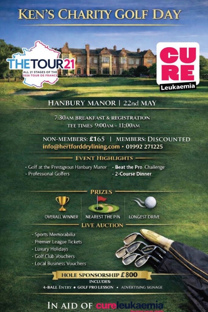This year, company director of Hertford Drylining, Kenneth Hayes, will be riding all 21 stages of The Tour de France on behalf of Cure Leukaemia, alongside a team of amateur cyclists – one week ahead of the professionals. This challenge will see the team tackle all 21 stages (approximately 3,500km) and they are doing it to help fund lifesaving research. To help Kenneth reach his goal of raising £30,000 for Cure Leukaemia, he is hosting a series of fundraising events – a charity night at The Blind Fiddler on 2nd May and a Charity Golf Day at Hanbury Manor on 22nd May. At both events there will be a raffle and auction, with items including Tyson Fury’s boxing gloves, holidays and Premier League Hospitality Tickets. Every penny goes directly towards the charity, funding clinical trials for blood cancer patients across the globe.