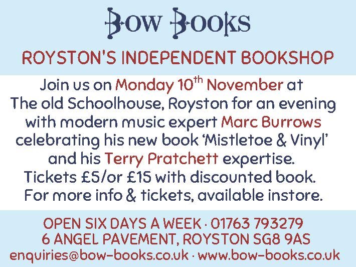An evening Talk with Marc Burrows Join us at the Old Schoolhouse, Royston, on Monday 10th November at 7.30pm for a lively evening with music expert Marc Burrows. Marc shares insights from his new book ‘Mistletoe and Vinyl’, exploring the fascinating battle for the Christmas Number 1 hit from the Beatles era to the present day. After the interval, Marc will turn to the magical world of Terry Pratchett, drawing on his earlier acclaimed biography. Tickets just £5/or £15 including a signed copy of either book (RRP £14.99). Available only from the shop – or reserve by phone or email. 6 Angel Pavement, Royston SG8 9AS. Open Mon-Fri 10am-5pm & Sat 9am-5pm 01763 793279 | www.bow-books.co.ukenquiries@bow-books.co.uk